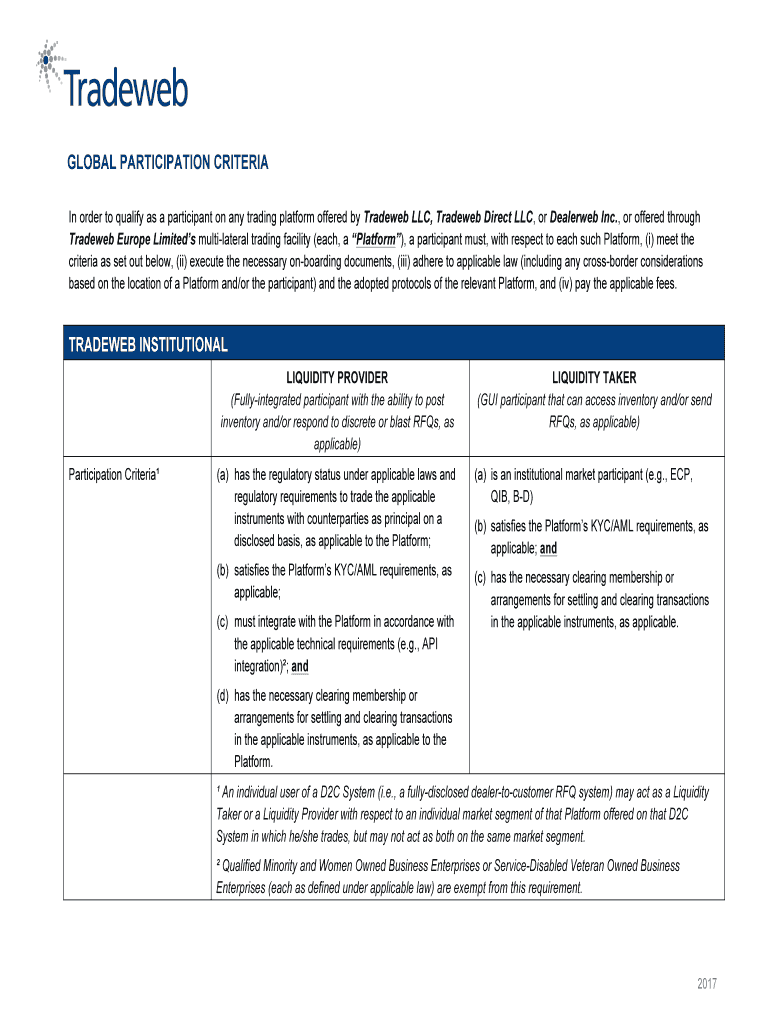 In order to qualify as a participant on any trading platform offered by Trade web LLC, Trade web Direct LLC, or Dealer web Inc., or offered through