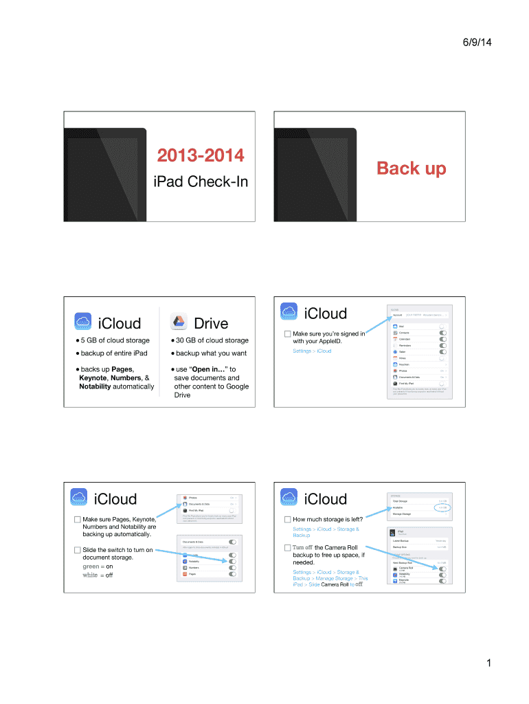 6/9/1420132014Back up iPad CheckIniCloudDrive5 GB of cloud storage30 GB of cloud storage backup of entire iPad backup what you want backs up Pages, Keynote, Numbers, & Notability automatically use