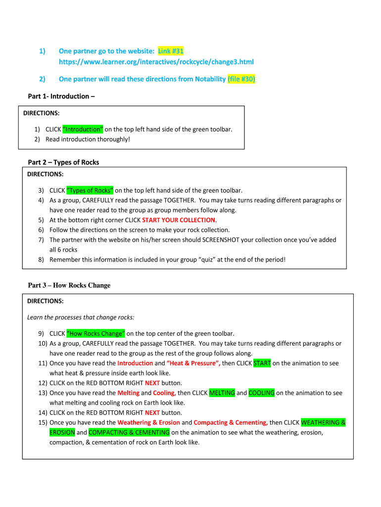 1)One partner go to the website: Link #31 https://www.learner.org/interactives/rockcycle/change3.html2)One partner will read these directions from Notability (file #30)Part 1 Introduction DIRECTIONS: