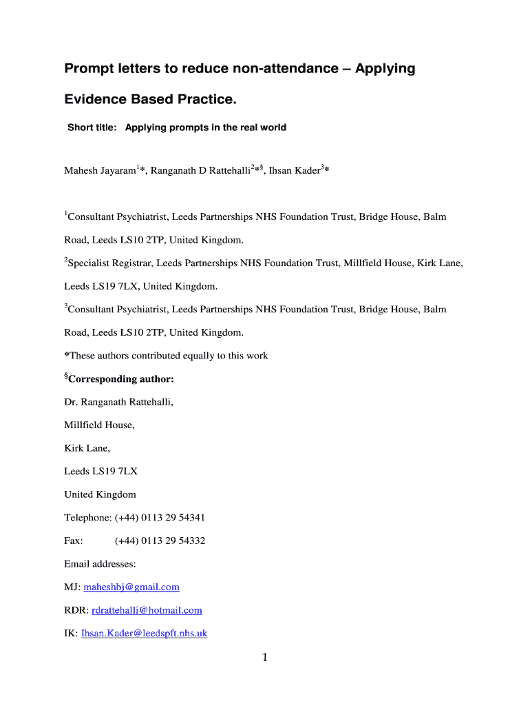 Prompt letters to reduce nonattendance Applying Evidence Based Practice. Short title: Applying prompts in the real worldMahesh Jayaram1×, Reincarnate D Rattehalli2×, Than Kader3×1Consultant Psychiatrist,