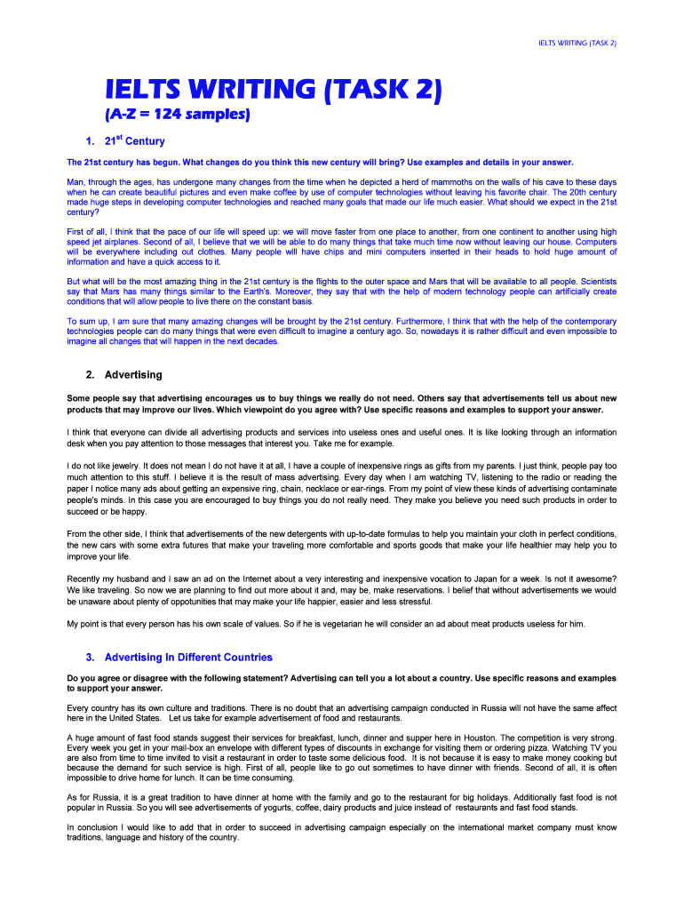 IELTS WRITING (TASK 2)IELTS WRITING (TASK 2) (A(AZ 124 samples) 1. 21st Century The 21st century has begun. What changes do you think this new century will bring? Use examples and details in your