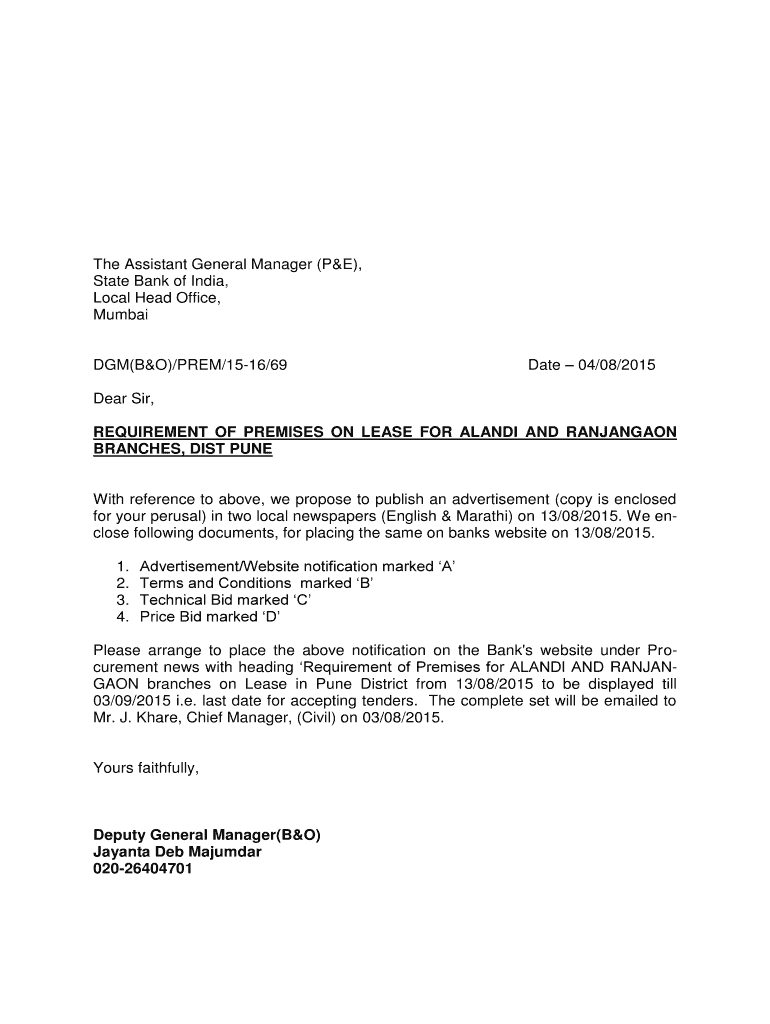 The Assistant General Manager (P&E), State Bank of India, Local Head Office, Mumbai(B&O)/POEM/1516/69Date 04/08/2015Dear Sir, REQUIREMENT OF PREMISES ON LEASE FOR ALADI AND RANJANGAON BRANCHES, DIST