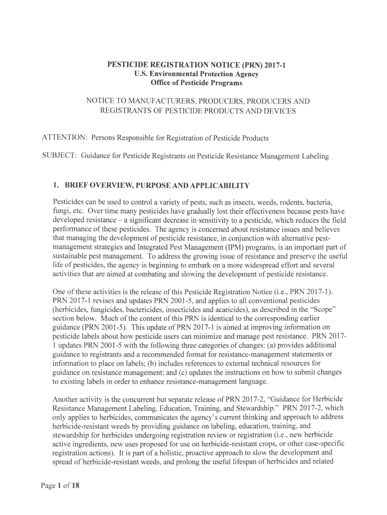 PESTICIDE REGISTRATION NOTICE (PRN) 20171U. S. Environmental Protection AgencyOffice of Pesticide ProgramsNOTICE TO MANUFACTURERS, PRODUCERS, PRODUCERS REGISTRANTS OF PESTICIDE PRODUCTS AND DEVICESATTENTION: