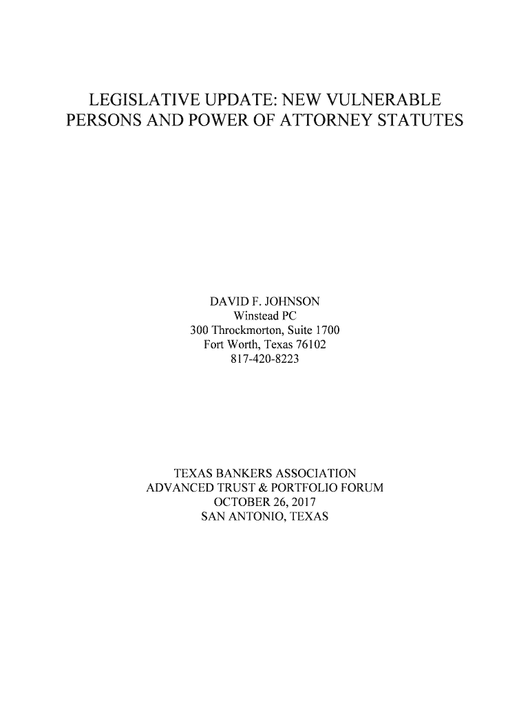 LEGISLATIVE UPDATE: NEW VULNERABLE PERSONS AND POWER OF ATTORNEY STATUTESDAVID F. JOHNSON Instead PC 300 Throckmorton, Suite 1700 Fort Worth, Texas 76102 8174208223TEXAS BANKERS ASSOCIATION ADVANCED