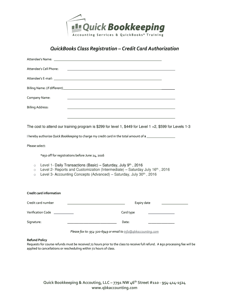 QuickBooks Class Registration Credit Card Authorization Attendees Name: Attendees Cell Phone: Attendees Email: Billing Name: (if different) Company Name: Billing Address:The cost to attend our training