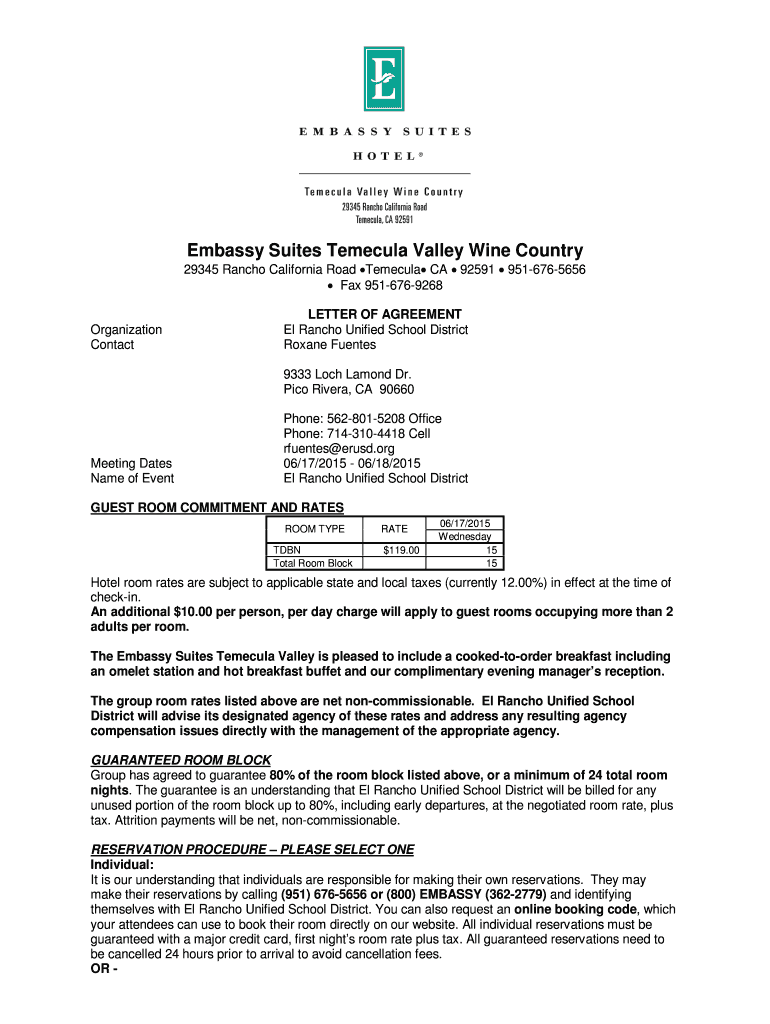 Embassy Suites Temecula Valley Wine Country 29345 Rancho California Road Temecula CA 92591 9516765656 Fax 9516769268 Organization ContactLETTER OF AGREEMENT El Rancho Unified School District Roxanne