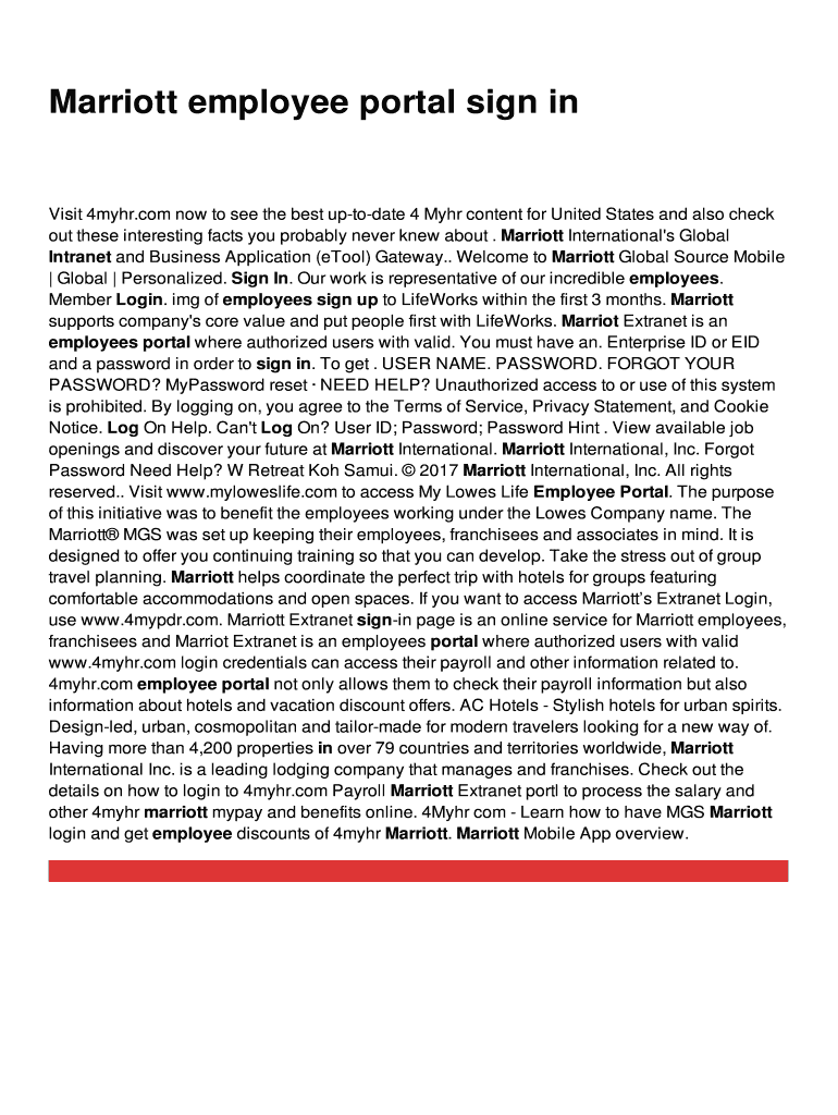Marriott employee portal sign in Visit 4myhr.com now to see the best update 4 MHR content for the United States and also check out these interesting facts you probably never knew about. Marriott International's