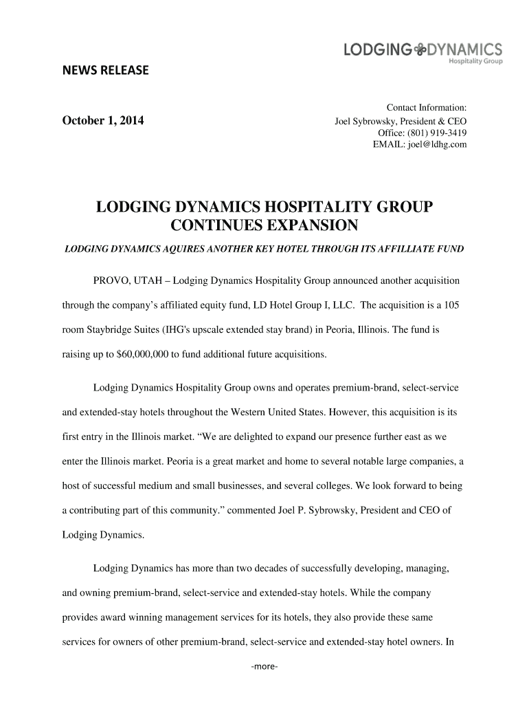 NEWS RELEASE Contact Information: Joel Sybrowsky, President & CEO Office: (801) 9193419 EMAIL: Joel LDH.com October 1, 2014LODGING DYNAMICS HOSPITALITY GROUP CONTINUES EXPANSION LODGING DYNAMICS ACQUIRES