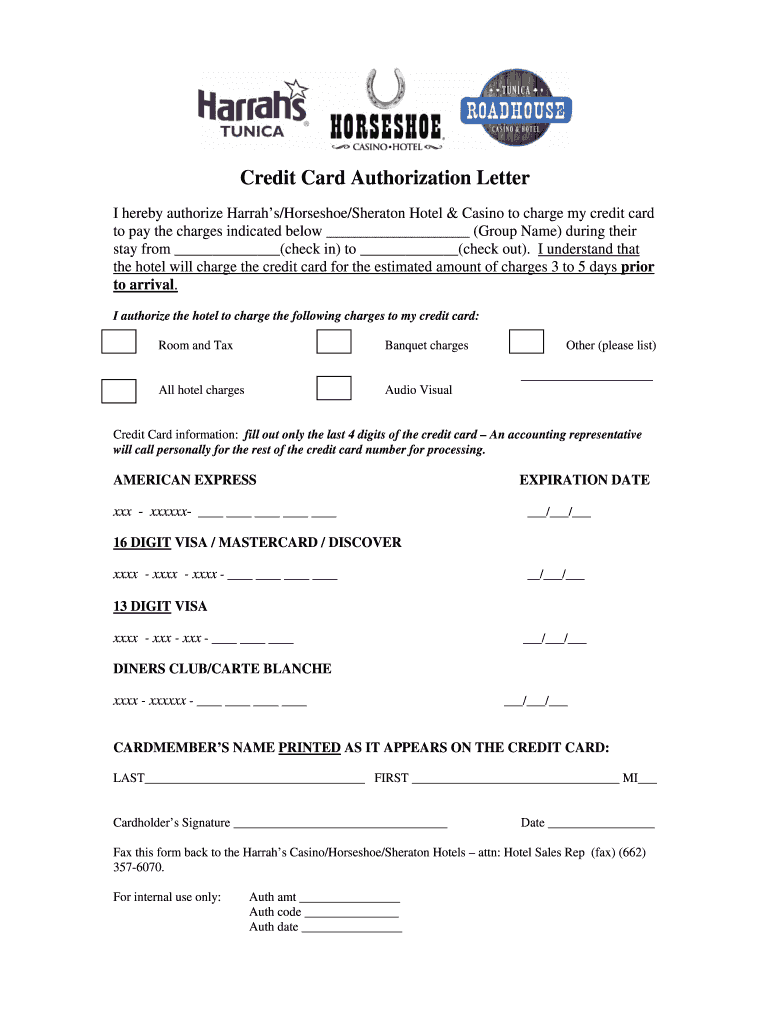 Credit Card Authorization Letter I hereby authorize Hurrahs/Horseshoe/Sheraton Hotel & Casino to charge my credit card to pay the charges indicated below (Group Name) during their stay from (check