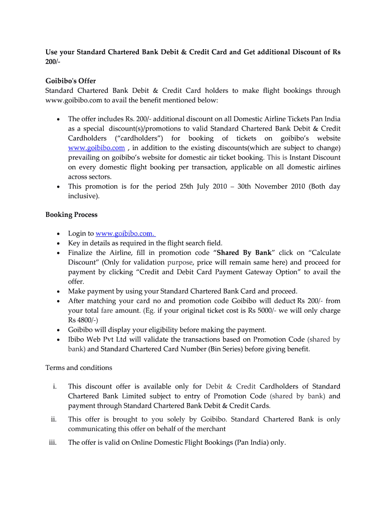 Use your Standard Chartered Bank Debit & Credit Card and Get additional Discount of Rs 200/Gibbs's Offer Standard Chartered Bank Debit & Credit Card holders to make flight bookings through www.goibibo.com