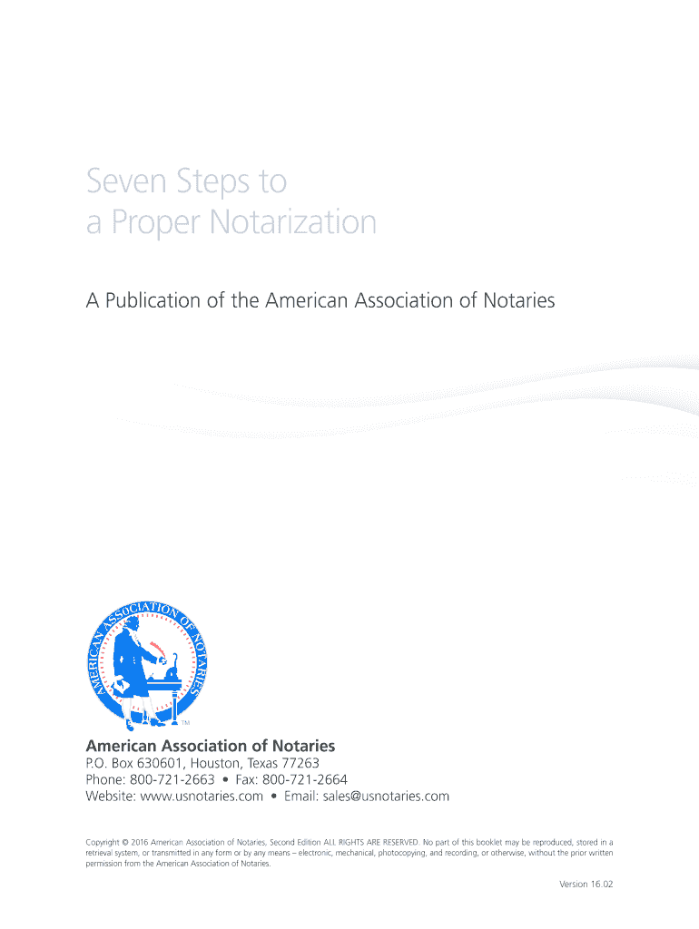 Seven Steps to a Proper Notarization A Publication of the American Association of Notaries American Association of Notaries P.O. Box 630601, Houston, Texas 77263 Phone: 8007212663 Fax: 8007212664