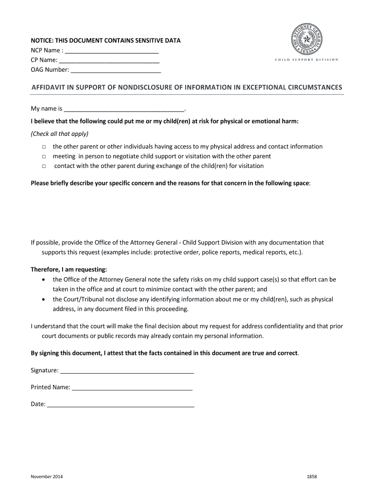 NOTICE: THIS DOCUMENT CONTAINS SENSITIVE DATA NCP Name : CP Name: TAG Number: AFFIDAVIT IN SUPPORT OF NONDISCLOSURE OF INFORMATION IN EXCEPTIONAL CIRCUMSTANCES My name is. I believe that the following