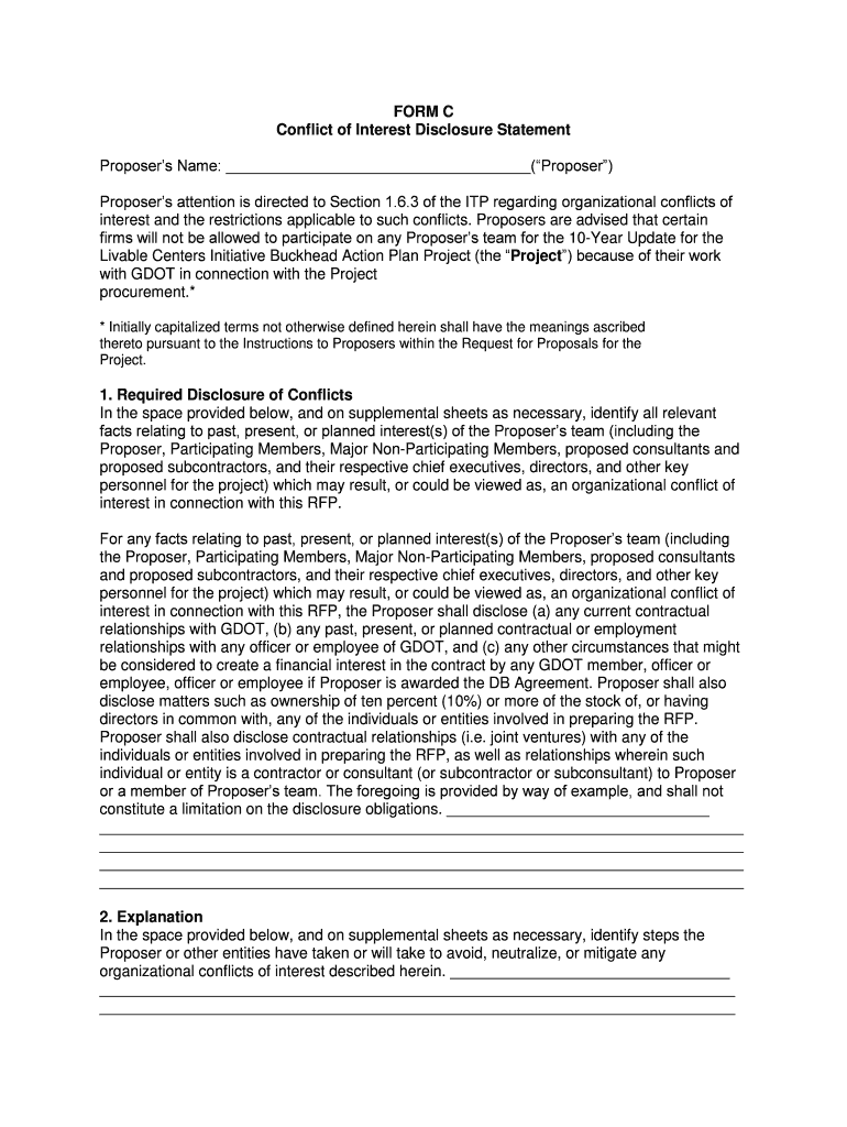 FORM C Conflict of Interest Disclosure Statement Proposers Name: (Proposer) Proposers attention is directed to Section 1.6.3 of the ITP regarding organizational conflicts of interest and the restrictions