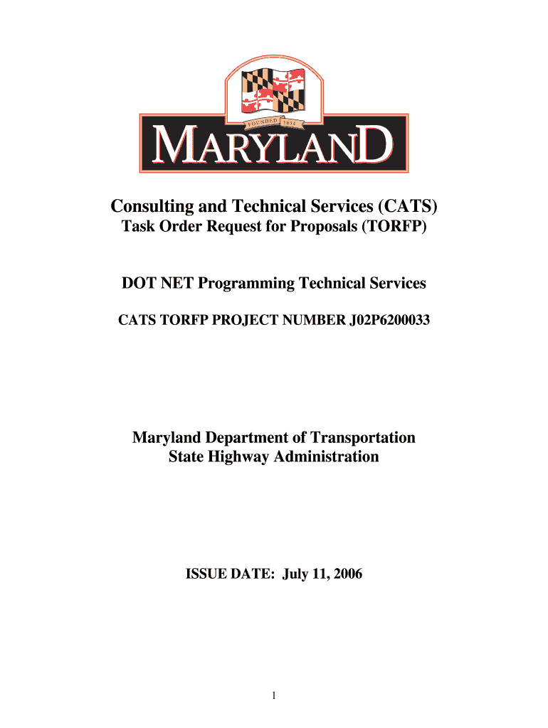 Consulting and Technical Services (CATS) Task Order Request for Proposals (TO RFP) DOT NET Programming Technical Services CATS TO RFP PROJECT NUMBER J02P6200033 Maryland Department of Transportation