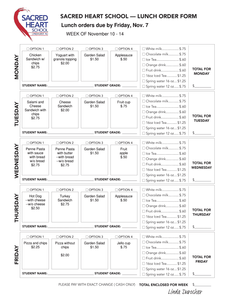 SACRED HEART SCHOOL LUNCH ORDER FORM Lunch orders due by Friday, Nov. 7MONDAYWEEK OF November 10 14 n OPTION 1n OPTION 2n OPTION 3n OPTION 4Chicken Sandwich w/ chips $2.75Yoguart with granola topping