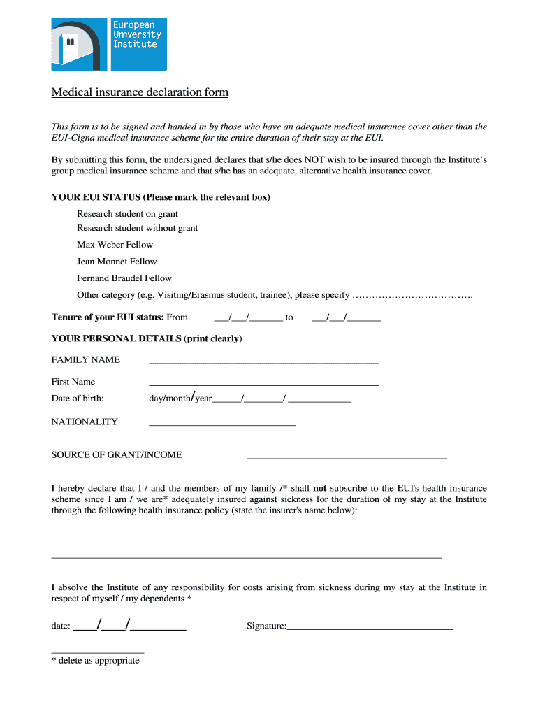 This form is to be signed and handed in by those who have an adequate medical insurance cover other than the