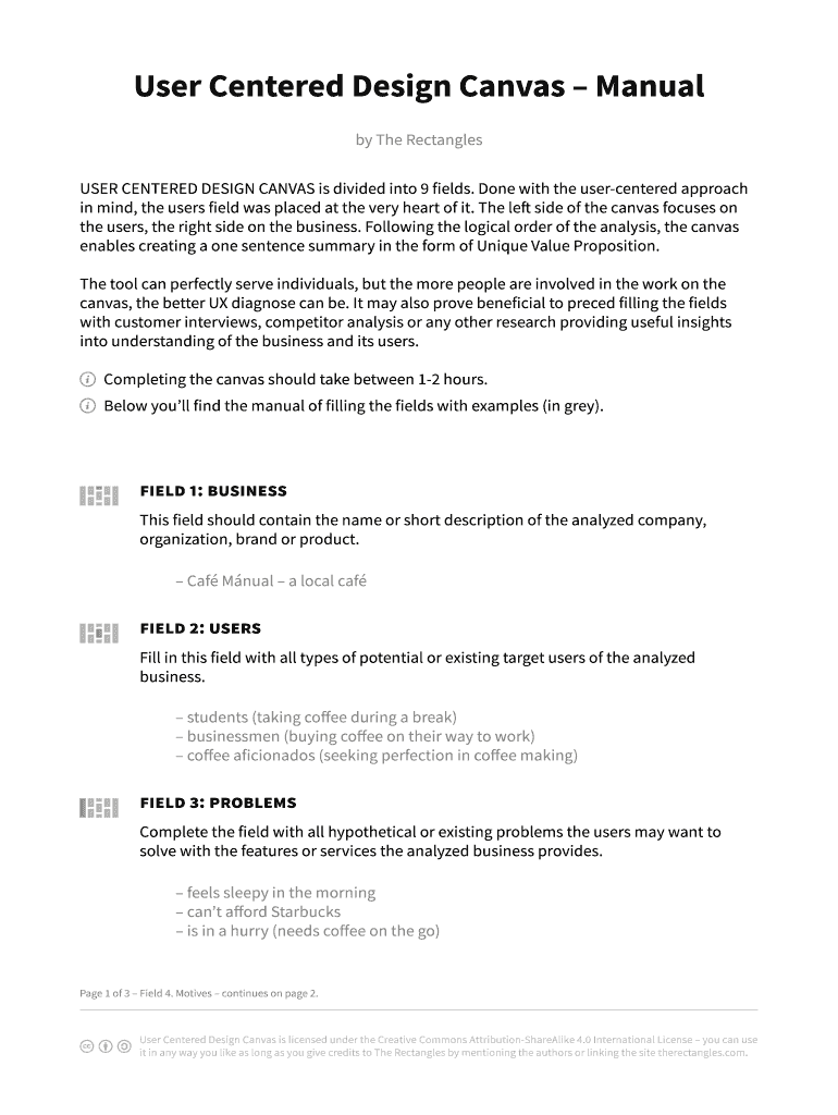 USER CENTERED DESIGN CANVAS is divided into 9 fields. Done with the user centered approach