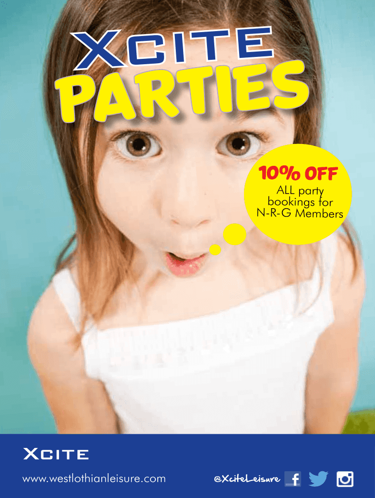 Cite S E I T R PA10% offal party bookings for NRG MembersXcite www.westlothianleisure.com XciteLeisureXcitePARTIESSpaceBugs Soft Play Party 18 months 7 years Have an adventurous, rocket jumping party