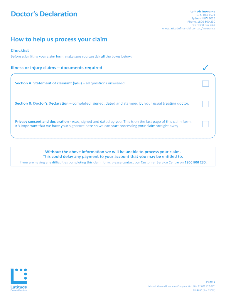 Doctors DeclarationLatitude Insurance GPO Box 1571 Sydney NSW 1025 Phone: 1800 800 230 Fax: 1300 362 642 www.latitudefinancial.com.au/insuranceHow to help us process your claim Checklist Before submitting