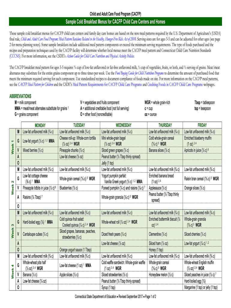 Get the free Sample Cold Breakfast Menus for CACFP Child Care Centers and Homes