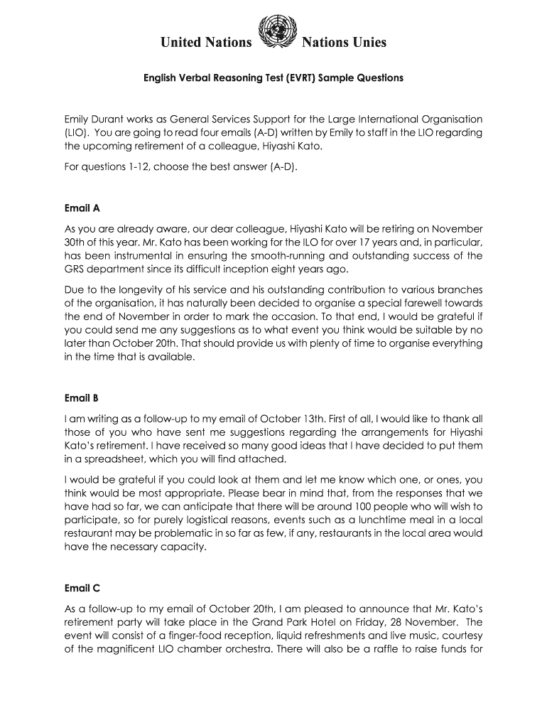 United NationsNations UniesEnglish Verbal Reasoning Test (EVERT) Sample Questions Emily Durant works as General Services Support for the Large International Organization
