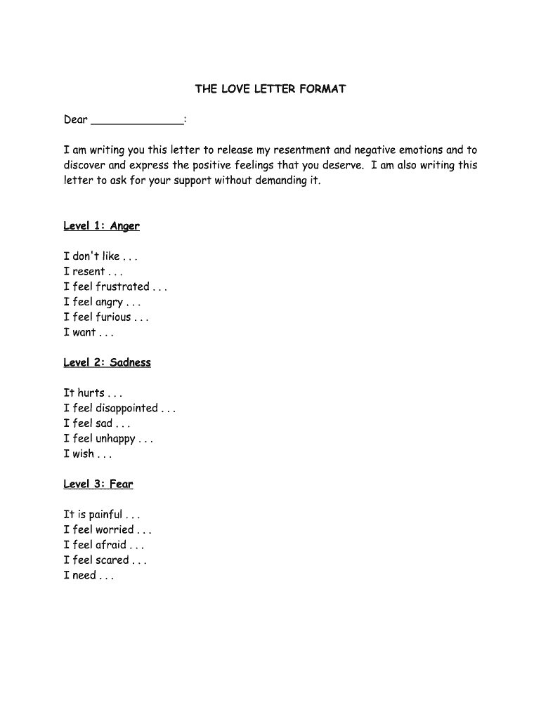THE LOVE LETTER FORMAT Dear : I am writing you this letter to release my resentment and negative emotions and to discover and express the positive feelings that you deserve. I am also writing this