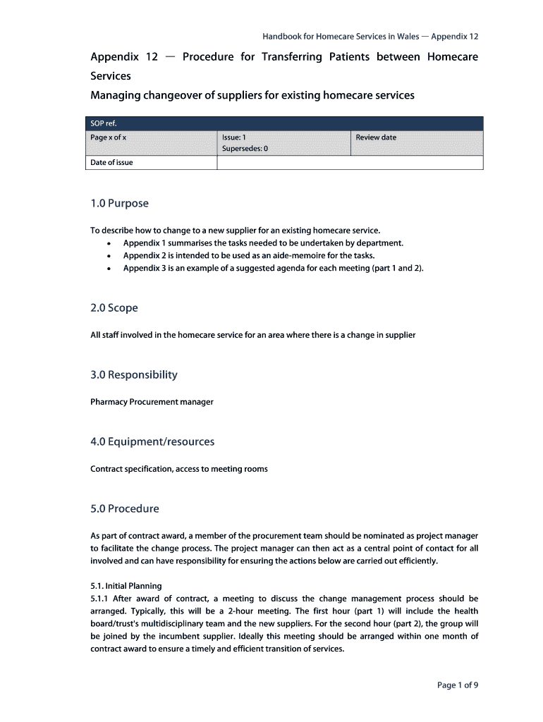 Handbook for Home care Services in Wales Appendix 12Appendix 12 Procedure for Transferring Patients between Home care Services Managing changeover of suppliers for existing home care services SOP