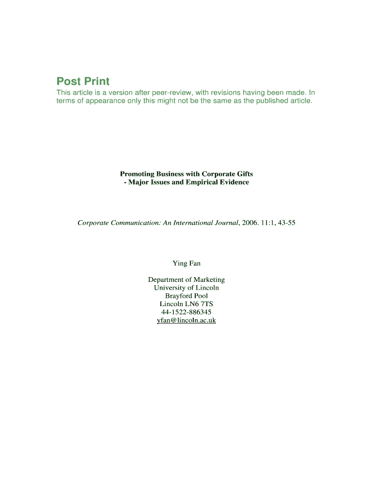 Post Print This article is a version after peer review, with revisions having been made. In terms of appearance only this might not be the same as the published article. Promoting Business with Corporate