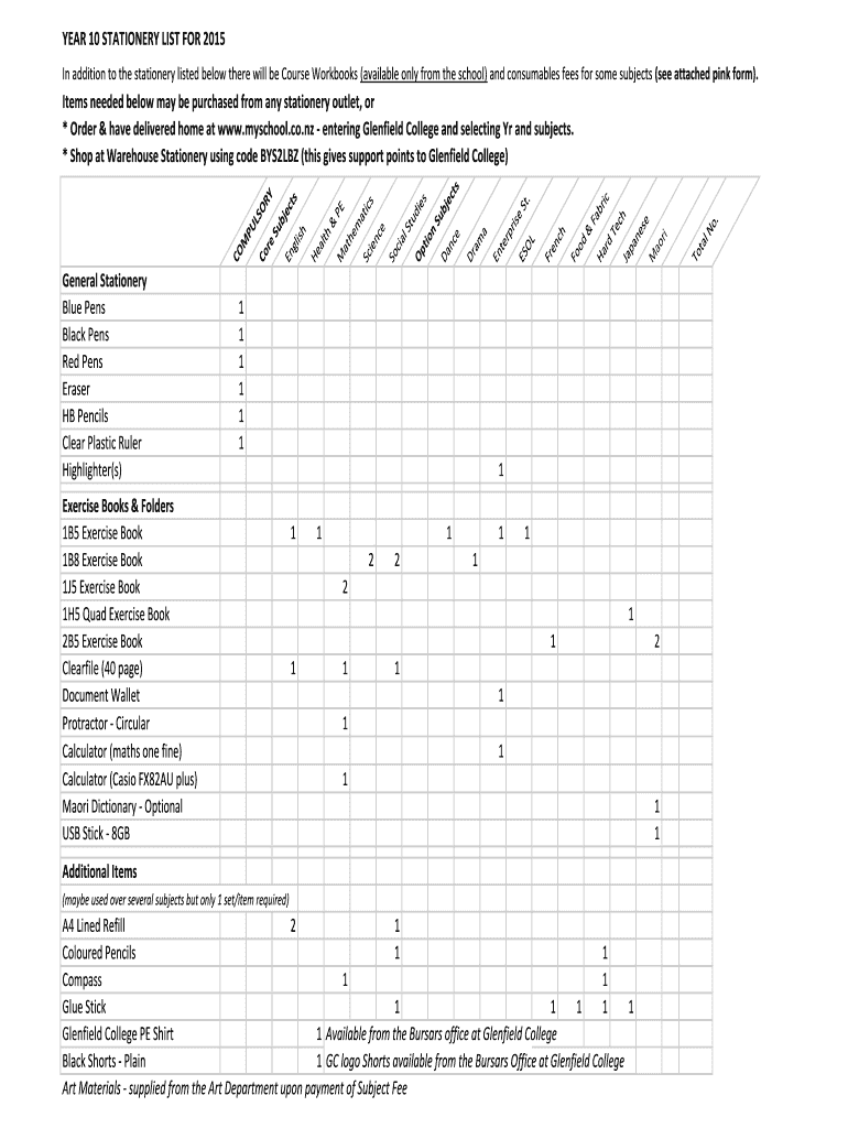 YEAR 10 STATIONERY LIST FOR 2015 In addition to the stationery listed below there will be Course Workbooks (available only from the school) and consumables fees for some subjects (see attached pink