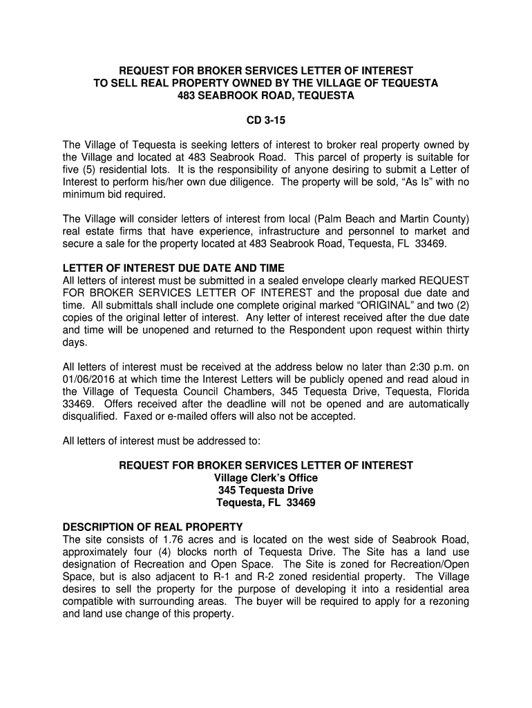 REQUEST FOR BROKER SERVICES LETTER OF INTEREST
