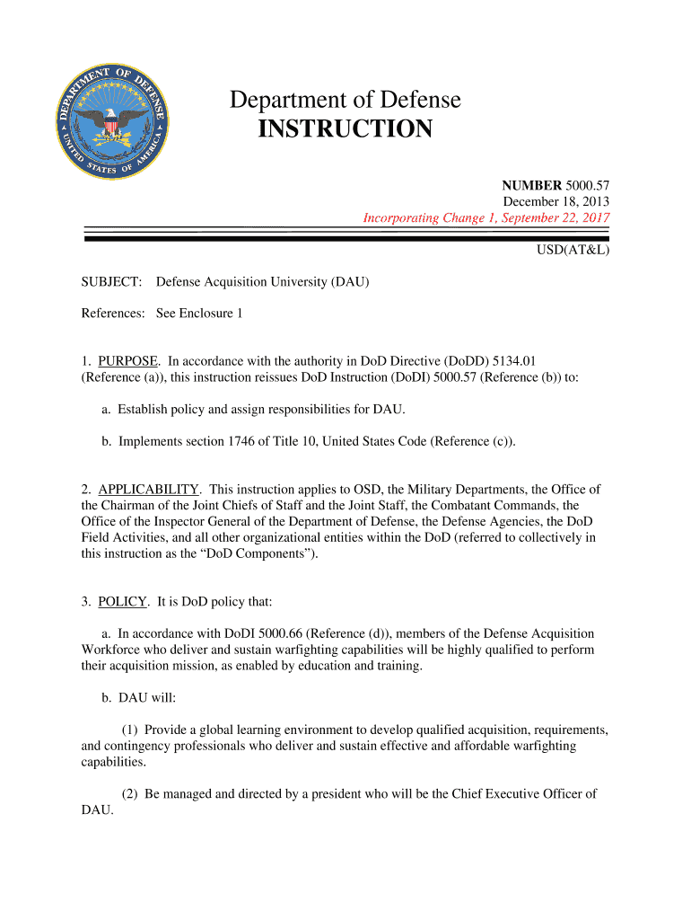 Department of Defense INSTRUCTION NUMBER 5000.57 December 18, 2013, Incorporating Change 1, September 22, 2017, USD(AT&T) SUBJECT:Defense Acquisition University (DAU)References: See Enclosure 11.