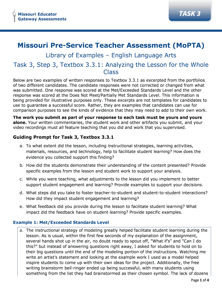 Missouri PreService Teacher Assessment (Mo PTA) Library of Examples English Language Arts Task 3, Step 3, Text box 3.3.1: Analyzing the Lesson for the Whole Class Below are two examples of written