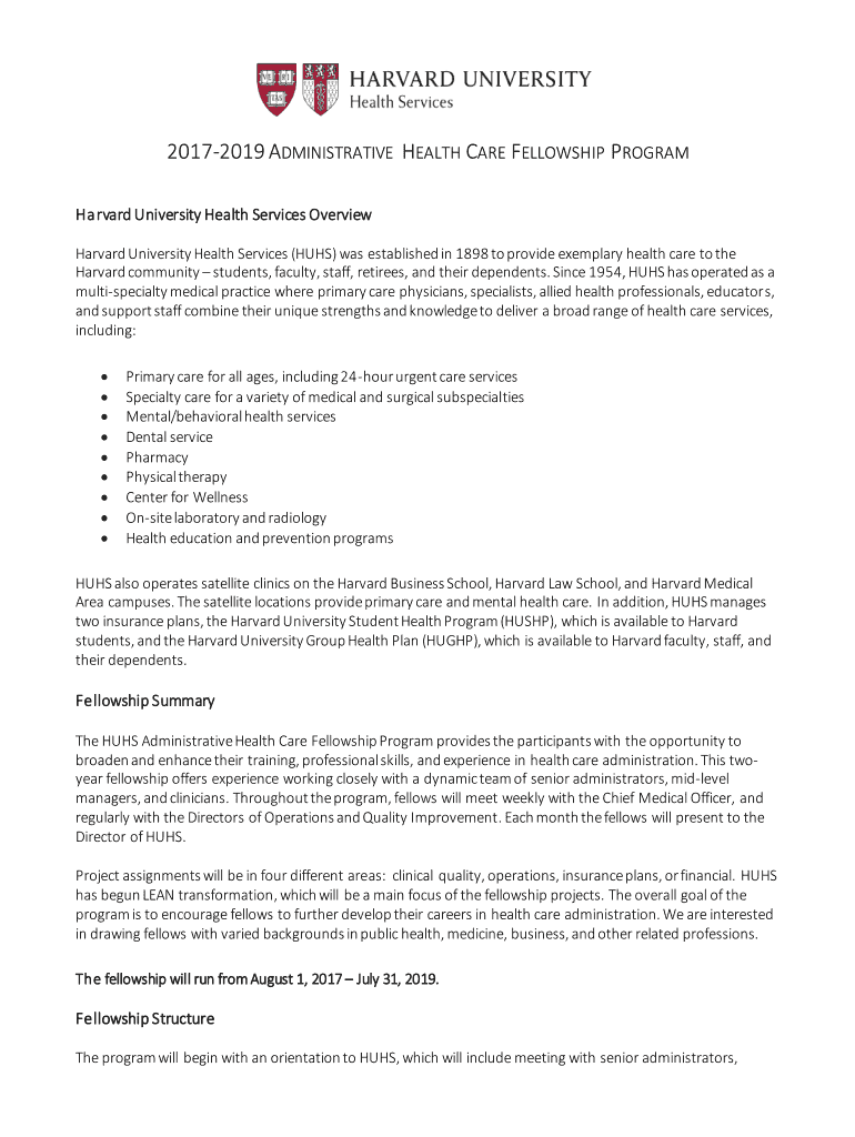 20172019 ADMINISTRATIVE HEALTH CARE FELLOWSHIP PROGRAM Harvard University Health Services Overview Harvard University Health Services (HUTS) was established in 1898 to provide exemplary health care