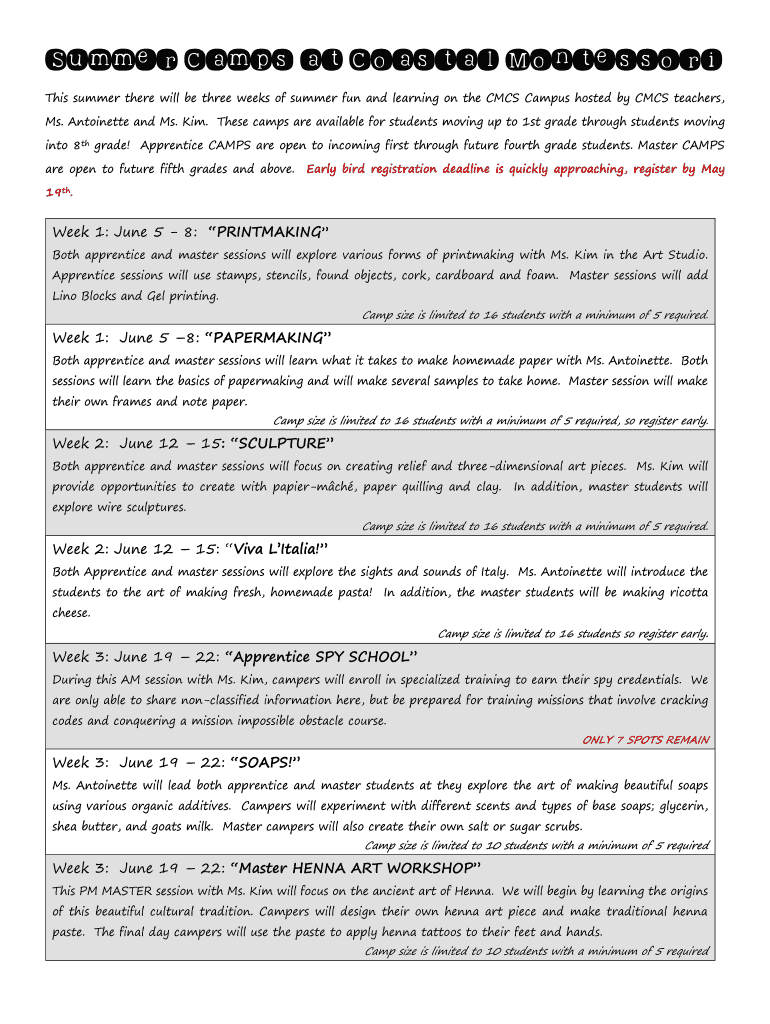 Edit summer camps at coastal. Rearrange and rotate pages, insert new and alter existing texts, add new objects, and take advantage of other helpful tools. Click Done to apply changes and return to your Dashboard. Go to the Documents tab to access merging, splitting, locking, or unlocking functions.