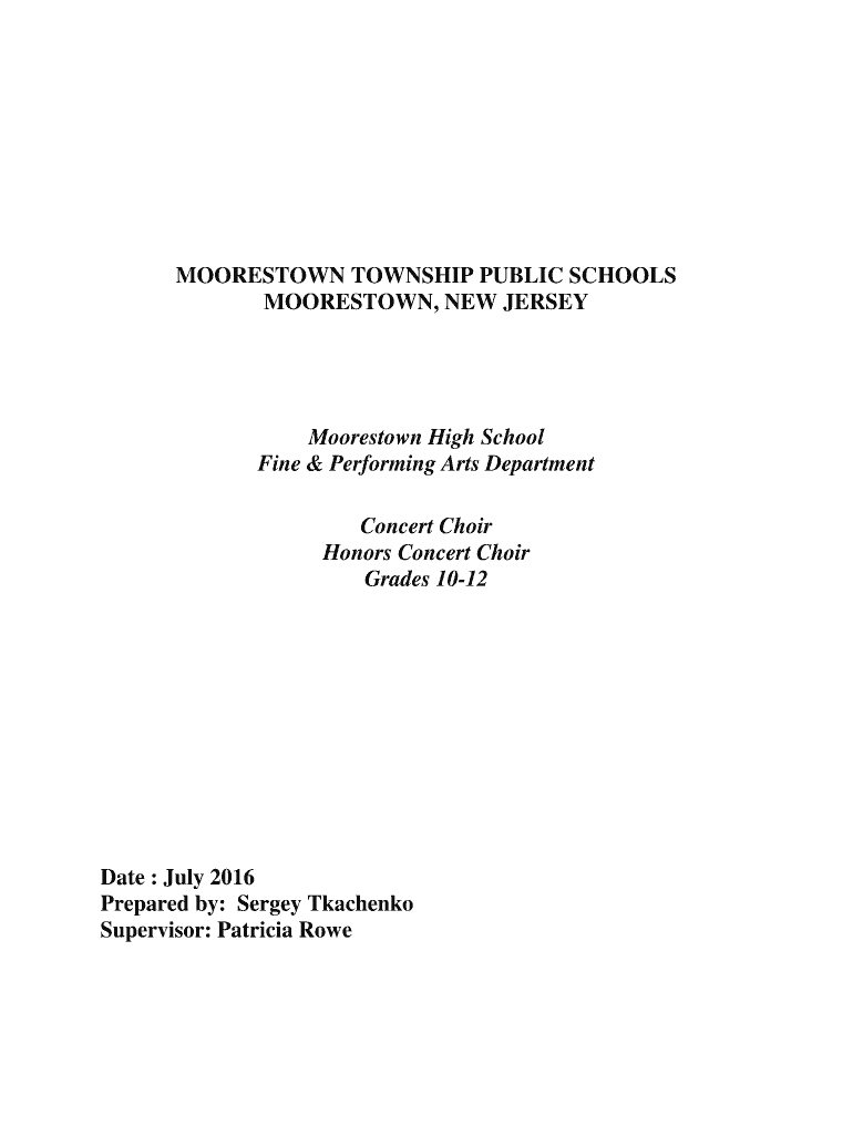 MORRISTOWN TOWNSHIP PUBLIC SCHOOLS MORRISTOWN, NEW JERSEYMoorestown High School Fine & Performing Arts Department Concert Choir Honors Concert Choir Grades 1012Date : July 2016 Prepared by: Sergey