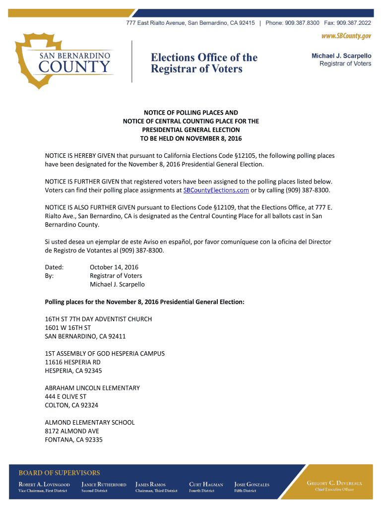 NOTICE OF CENTRAL COUNTING PLACE FOR THE