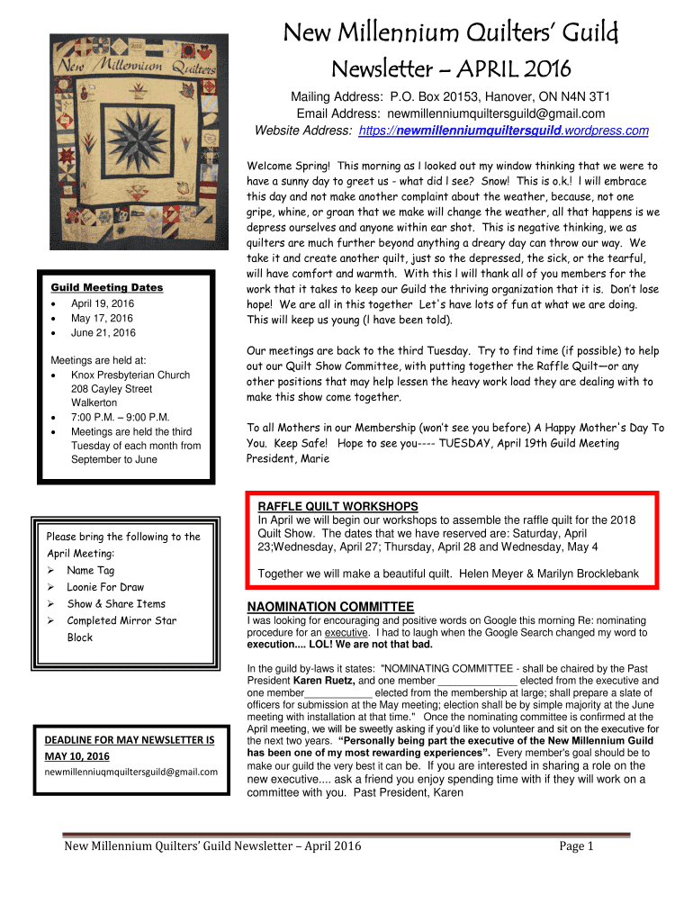 New Millennium Quilters Guild Newsletter APRIL 2016 Mailing Address: P.O. Box 20153, Hanover, ON N4N 3T1 Email Address: newmillenniumquiltersguild gmail.com Website Address: https://newmillenniumquiltersguild.wordpress.comGuild