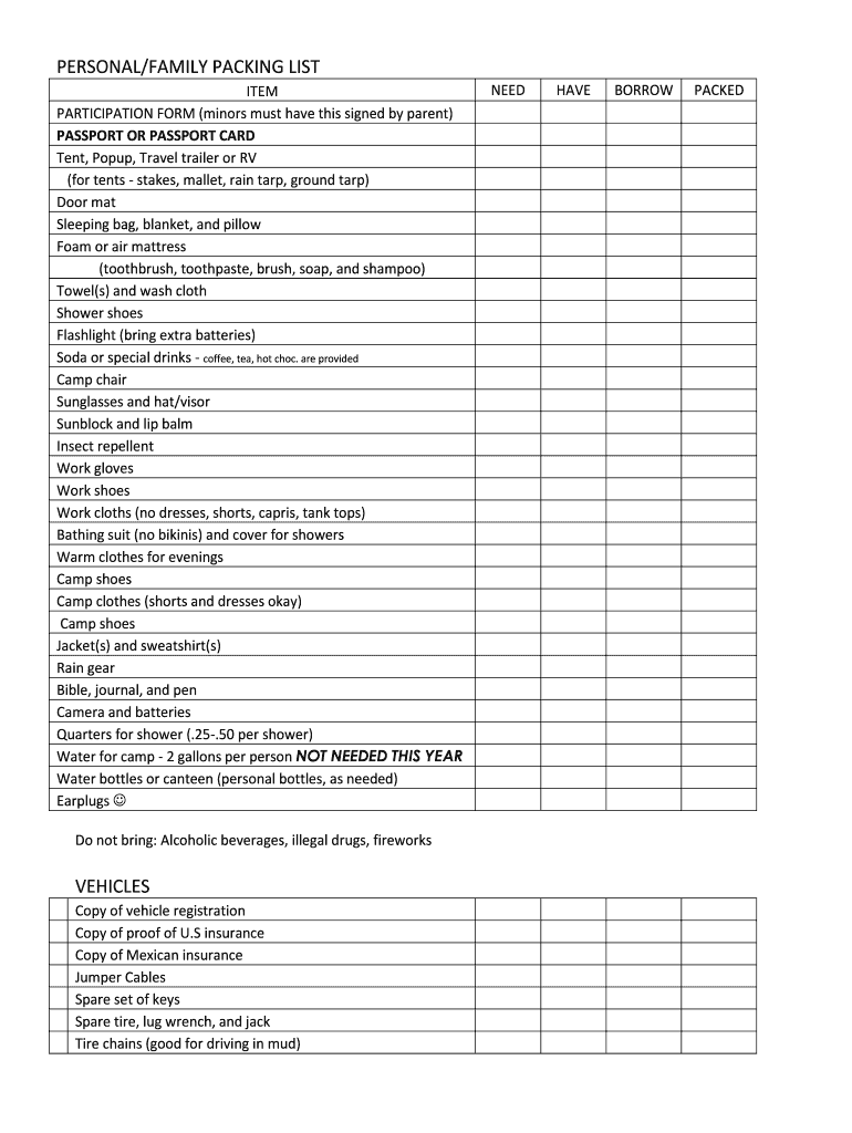 PERSONAL/FAMILY PACKING LIST ITEM PARTICIPATION FORM (minors must have this signed by parent) PASSPORT OR PASSPORT CARD Tent, Popup, Travel trailer or RV (for tents stakes, mallet, rain tarp, ground
