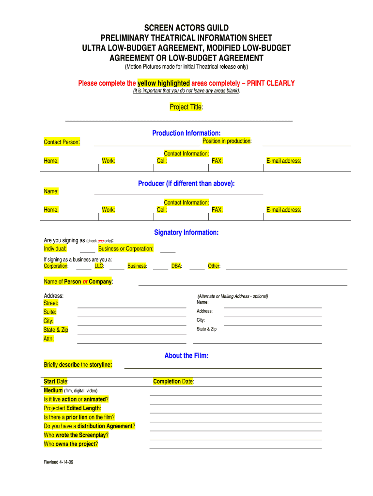 SCREEN ACTORS GUILD PRELIMINARY THEATRICAL INFORMATION SHEET ULTRA LOW-BUDGET AGREEMENT, MODIFIED LOW-BUDGET AGREEMENT OR LOW-BUDGET AGREEMENT (Motion Pictures made for initial Theatrical release