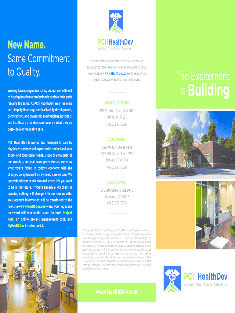 New Name. Same Commitment to Quality. For more information about our stateoftheart approach to medical real estate development, visit our new website www.HealthDev.com to read white papers, customer