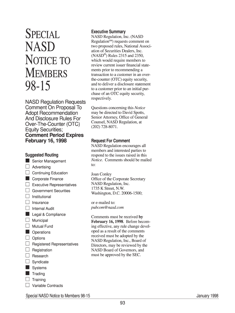 SPECIAL NASA NOTICE TO MEMBERS 9815 NASA Regulation Requests Comment On Proposal To Adopt Recommendation And Disclosure Rules For OverTheCounter (OTC) Equity Securities; Comment Period Expires February