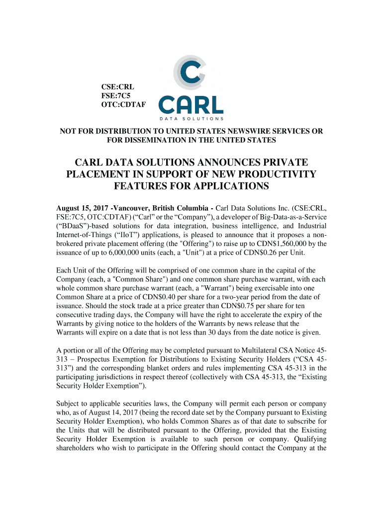 CSE:CRL FSE:7C5 OTC:CANNOT FOR DISTRIBUTION TO UNITED STATES NEWSGIRL SERVICES OR FOR DISSEMINATION IN THE UNITED STATESMAN DATA SOLUTIONS ANNOUNCES PRIVATE PLACEMENT IN SUPPORT OF NEW PRODUCTIVITY