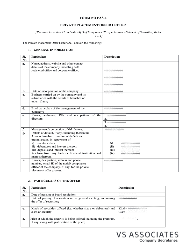 FORM NO PAS4 PRIVATE PLACEMENT OFFER LETTER Pursuant to section 42 and rule 14(1) of Companies (Prospectus and Allotment of Securities) Rules, 2014 The Private Placement Offer Letter shall contain