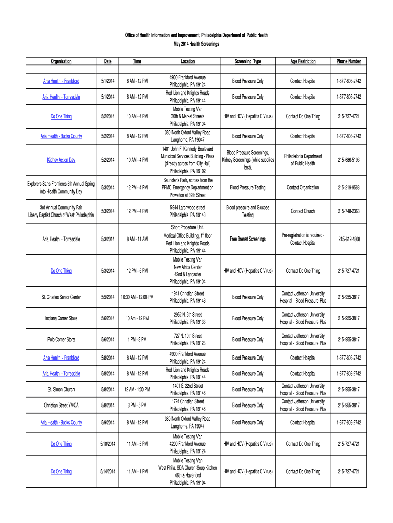 Office of Health Information and Improvement, Philadelphia Department of Public Health May 2014 Health Screenings OrganizationDateTimeAria Health Frankford5/1/20148 AM 12 Maria Health Torresdale5/1/20148