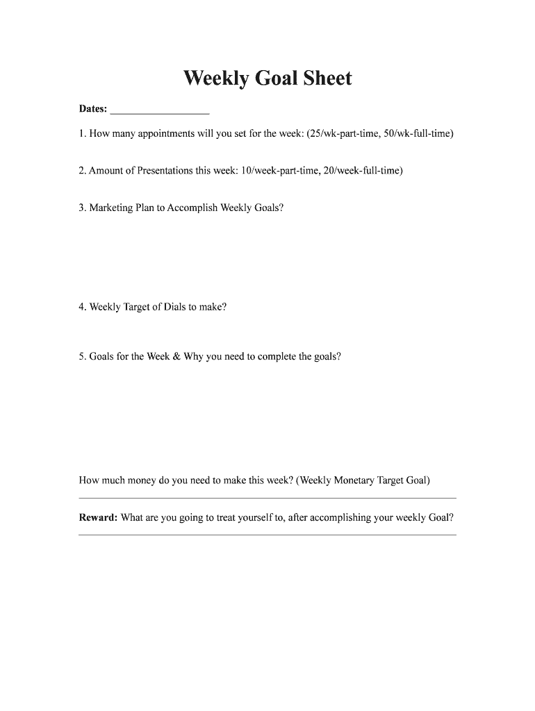 Weekly Goal Sheet Dates: 1. How many appointments will you set for the week: (25/wartime, 50/wkfulltime) 2. Amount of Presentations this week: 10/weekparttime, 20/weekfulltime) 3. Marketing Plan to