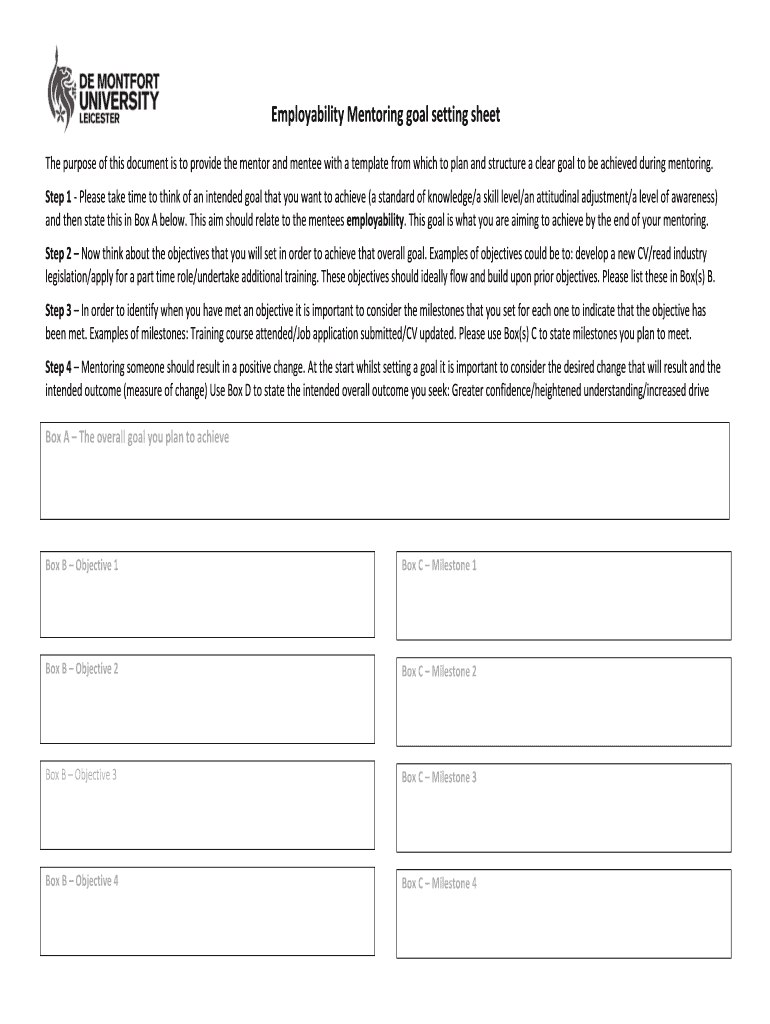 Employability Mentoring goal setting sheet The purpose of this document is to provide the mentor and mentee with a template from which to plan and structure a clear goal to be achieved during mentoring.