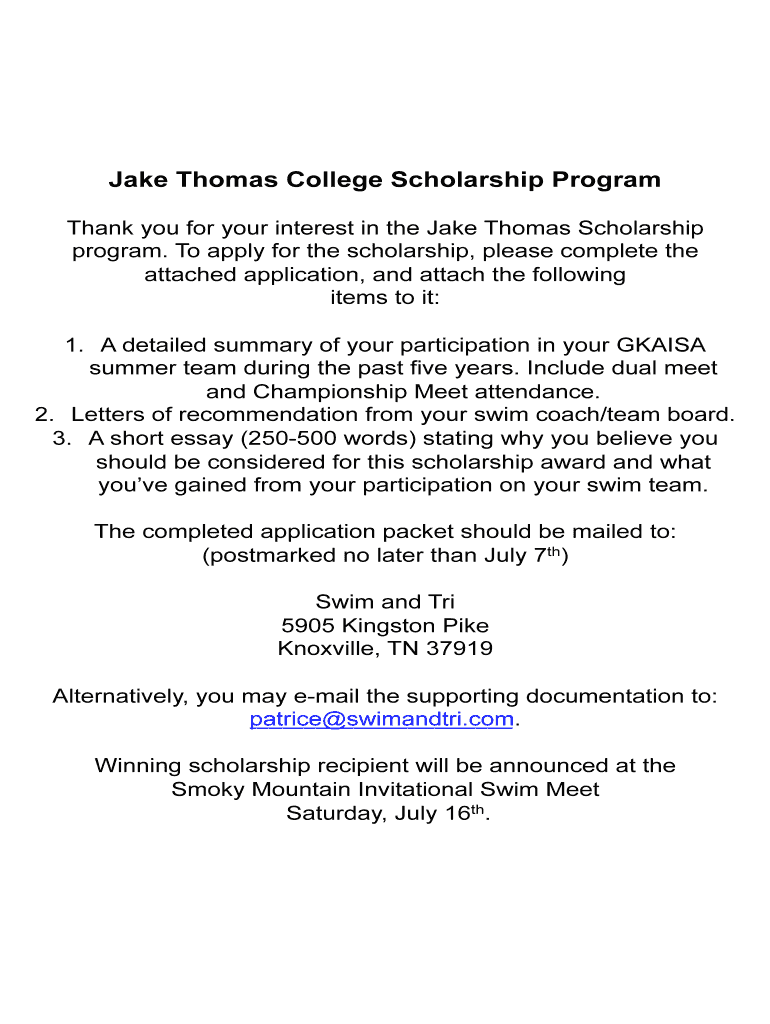 Get the free Thank you for your interest in the Jake Thomas Scholarship