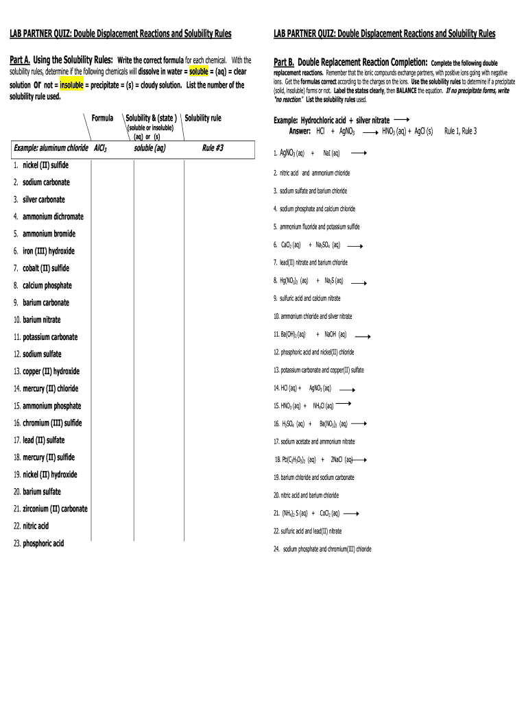 Get the free LAB PARTNER QUIZ: Double Displacement Reactions and Solubility Rules
