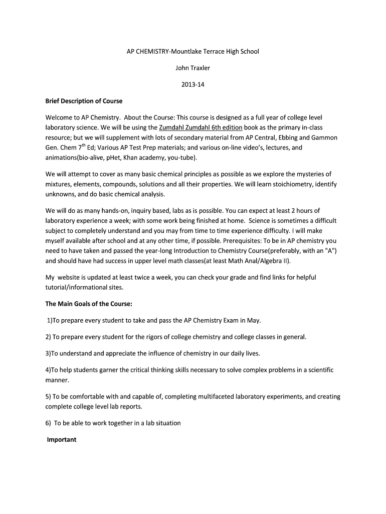 The purpose of the AP Chemistry course at Mountlake Terrace High School is to prepare students for success in college-level chemistry courses and exams.