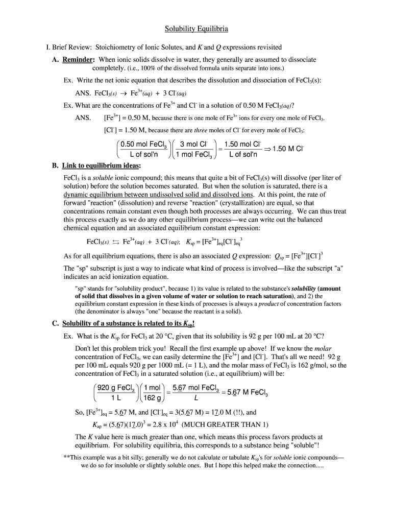 Solubility Equilibrium I. Brief Review: Stoichiometry of Ionic Solutes, and K and Q expressions revisited A. Reminder: When ionic solids dissolve in water, they generally are assumed to dissociate